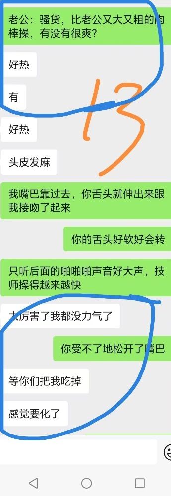 给技师舔肉棒后,还喊着技师快点来操死她。跟老公说技师的肉棒又粗又大的时候一直喊好舒服。夸赞我和技师两个人太厉害,把她搞得太舒服了不想动,感觉很飘,身体都不是自己的了,第一次有这样的感觉。两个人搞她,爽死她了,靠想象就被搞高潮了。